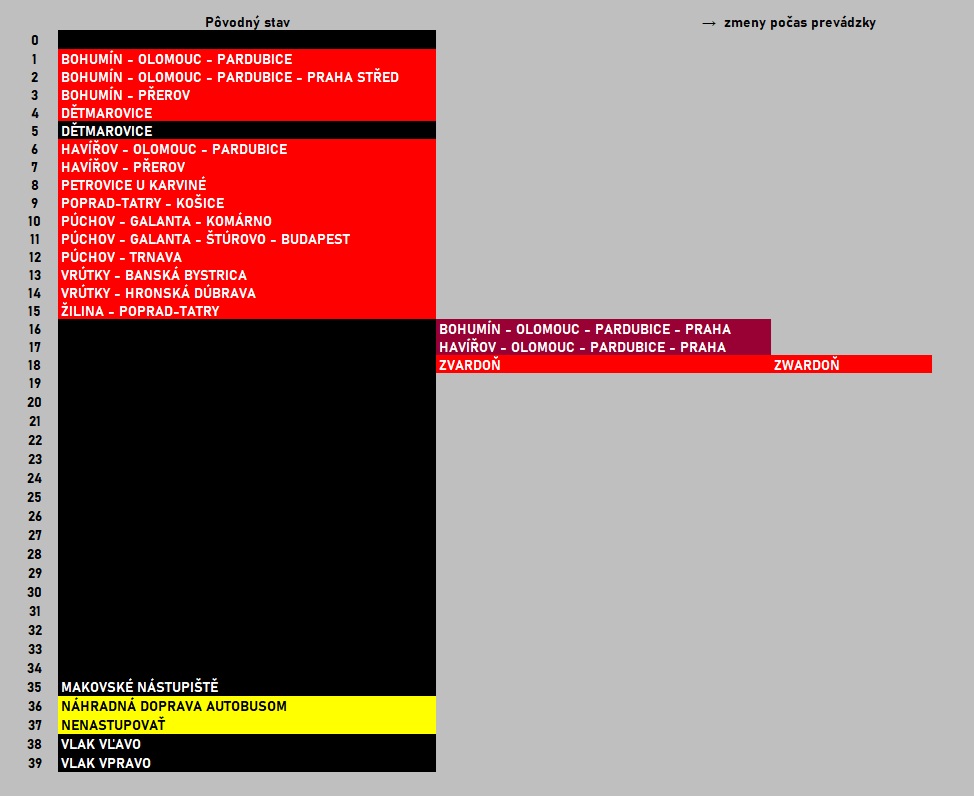 Informácie o obsahu teleindikačných listových jednotiek neboli spracované na základe oficiálnej dokumentácie železničnej stanice, ale na základe pozorovania prevádzky systému, resp. prostredníctvom analýzy dochovaných teleindikačných listových jednotiek v stave z konca prevádzky. Z uvedeného dôvodu údaje nemusia byť kompletné, prípadne môžu obsahovať chyby alebo nepresnosti.